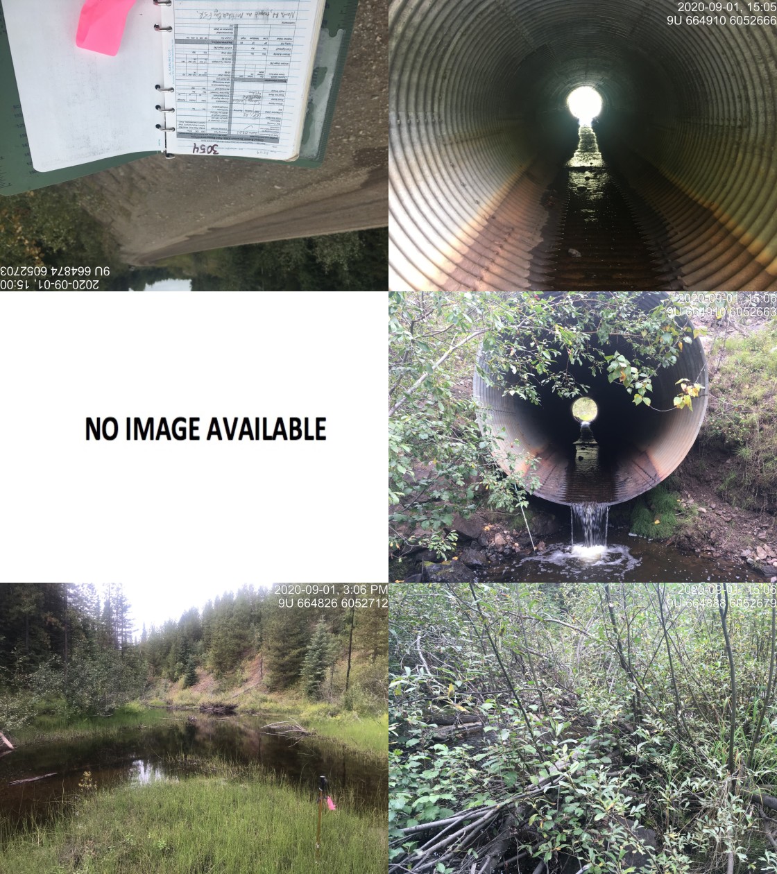 Photos: From top left clockwise: Road/Site Card, Barrel, Outlet, Downstream, Upstream, Inlet.