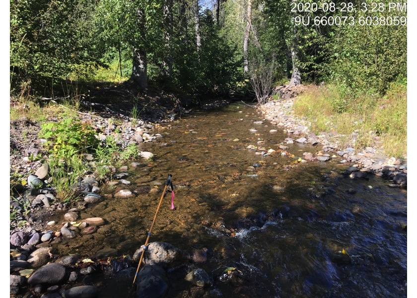 Barren Creek was surveyed upstream from 3042 for 400m (Figures 5.83 - 5.84). A beaver influenced wetland was located immediately upstream of crossing and extended upstream for more than 200m. Survey data was collected beginning from an area located approximately 900m upstream of crossing and terminating at the beaver dam controlled outlet of a small lake. Within the area surveyed, total cover amount was rated as moderate with undercut banks dominant. Cover was also present as deep pools, overhanging vegetation, and instream vegetation (Table 5.69). The average channel width was 2.4m, the average wetted width was 2.2m and the average gradient was 3%. The area surveyed varied from cobble/boulder channel flowing freely to primarily glide habitat with depths ranging from 60 - 100 cm in depth. There were occasional pockets of gravels in the channel near the start of the survey with some pools associated with large woody debris throughout. A large beaver pond/lake area was located at the top end of the site. Additional habitat information for areas upstream of the crossing are recorded in the provincial fisheries information summary system (MoE 2020c). Habitat value was rated as moderate for resident salmonid rearing and overwintering.