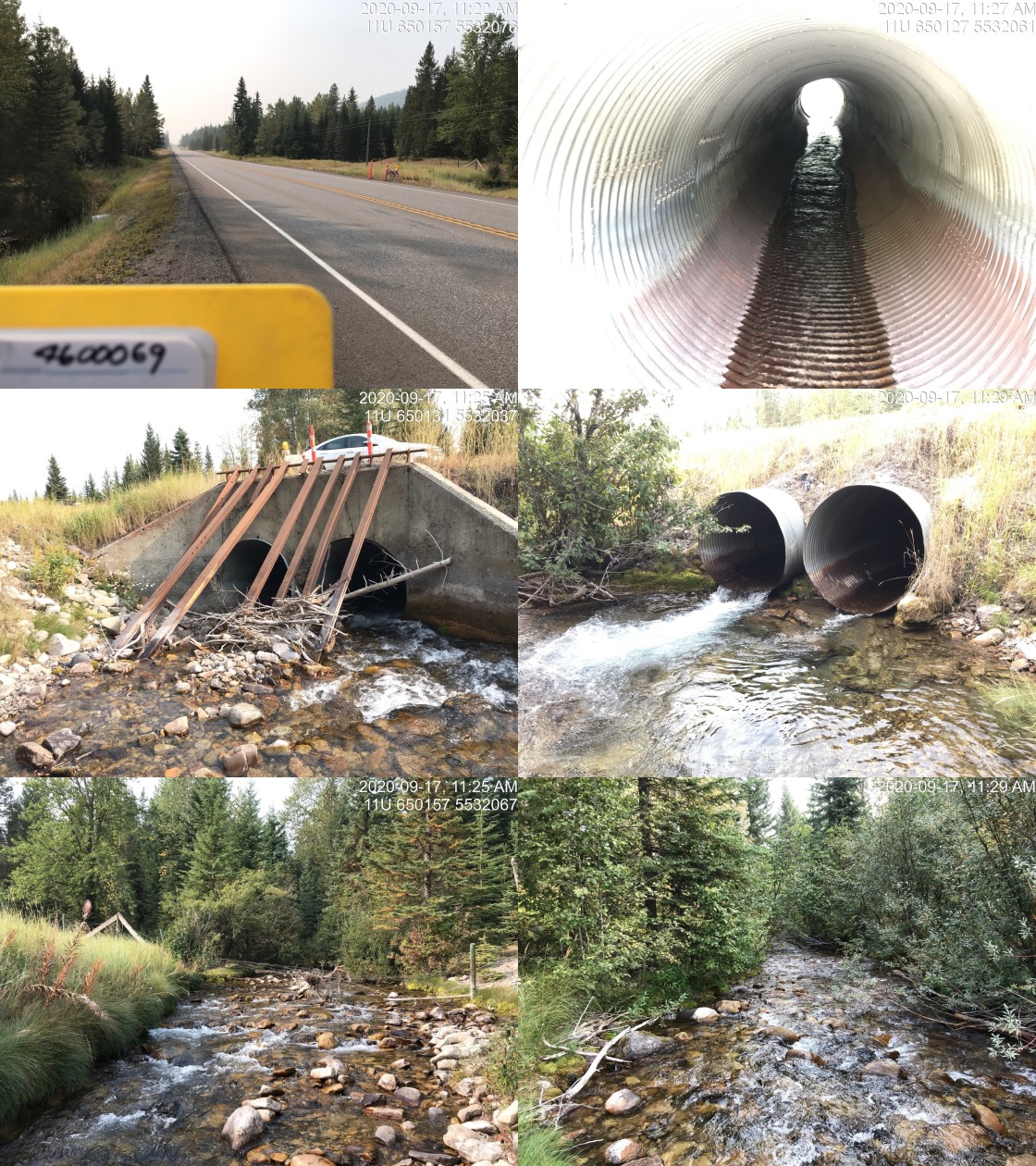 At the crossing location, the stream is fourth order with a watershed area upstream of the road of approximately 43.3 km2 situated between Phillips Peak and Mount VanBuskirk. The elevation of the watershed ranges from a maximum of 2950 to 1250m at the culvert. Although, there are several modelled crossings on the mainstem of Hartley Creek upstream of the crossing, 2020 surveys indicated they were either fords or bridges. Modelled crossing 4606006 is a ford located approximately 1.2km upstream of the highway. There are several additional crossings modelled further upstream on the mainstem, however it is suspected that these crossings have been removed to facilitate the motor vehicle restrictions in place in the watershed. Westslope cutthroat trout and bull trout have been recorded in Weigert Creek downstream of PCSIS 197534. Although multiple upstream survey sites are recorded within provincial databases, there have been no fish recorded upstream (MoE 2020d, 2020b).