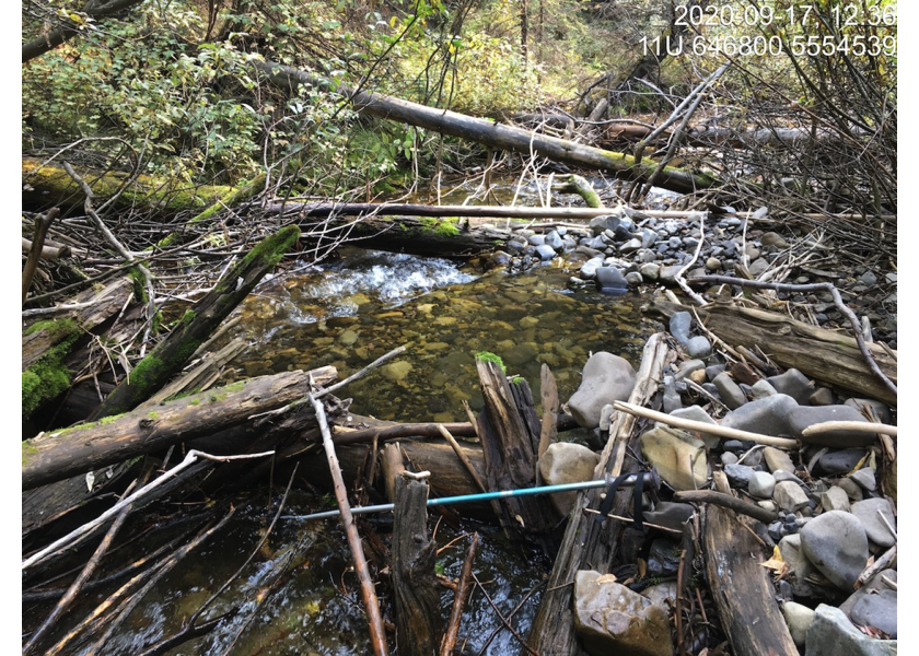 At the crossing location, the stream is 4th order with a watershed area upstream of the road of approximately 17km2. The elevation of the watershed ranges from a maximum of 2900 to 1400m at the culvert. Upstream of the crossing, there are no anthropogenic barriers on the mainstem. Although there are two modelled crossings on small tributaries that enter the stream approximately 1.5km upstream of the road, machinery operators encountered onsite indicated that they had been removed during road deactivation. No fisheries information was available for the stream (MoE 2020d) however westslope cutthroat trout, bull trout, mountain whitefish, brook trout, longnose sucker and longnose dace (among other species) have been recorded downstream in the Elk River (MoE 2020b).