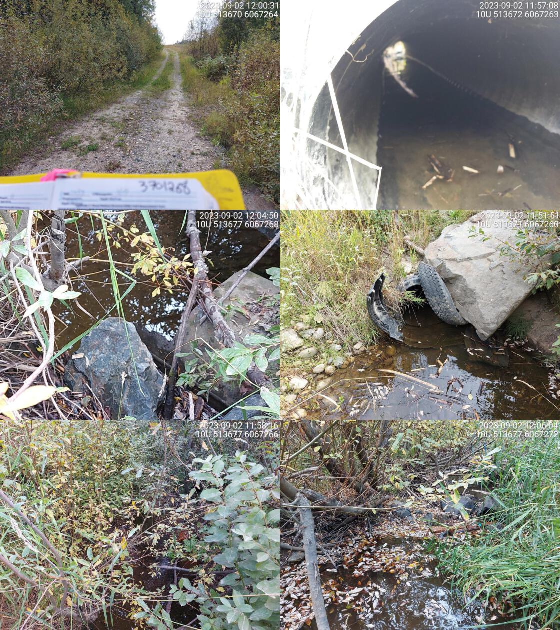 Comments: Large system with lots of water. 1.3 m high beaverdam 2 m above inlets. Two pipes at 2.0 m in size each. Beaver cage on west pipe inlet functioning to keep dam away from the actual inlet. Abundant gravel suitable for spawning downstream. Very nice stream and potential good candidate for replacement with a Bridge. 14:25:01