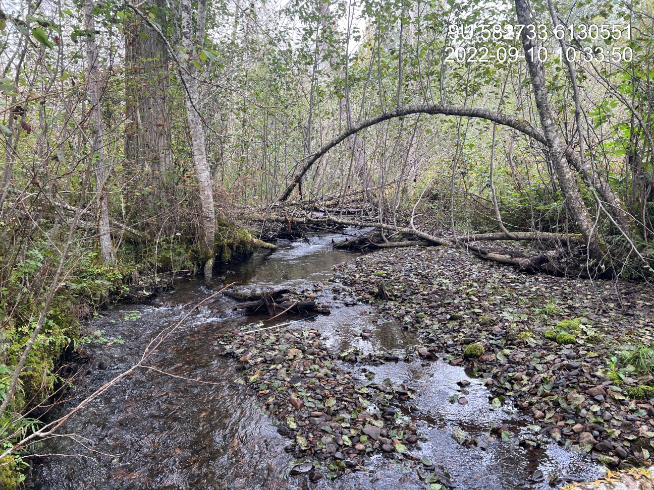 Comments: Culvert appears very old and near end of life. Nice gravels upstream. Flow is moving between the two 1 m pipes. Trash rack on inlet could be barrier to adult coho migrating upstream. 10:57