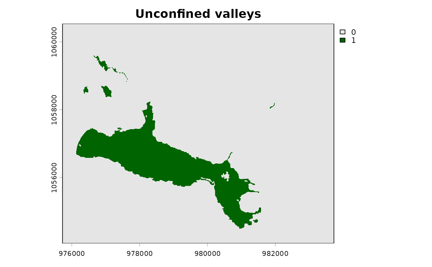 terra::plot(valleys, col = c("grey90", "darkgreen"), main = "Unconfined valleys")