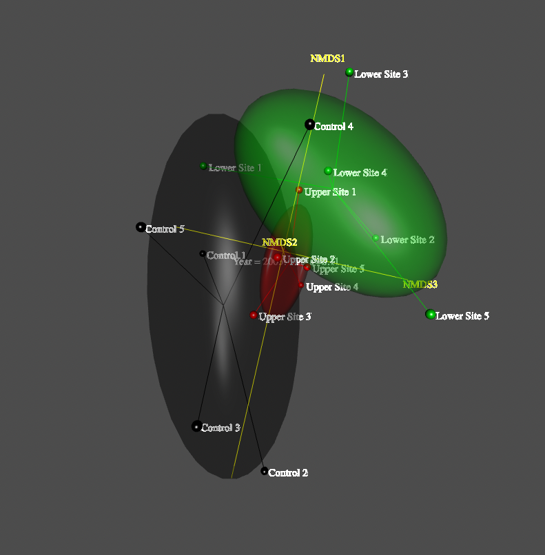 Non-metric Multidimensional Scaling (NMDS) ordination models incorporated in both report 2D plots and interactive 3D deliverables to communicate community assemblage patterns to environmental managers.